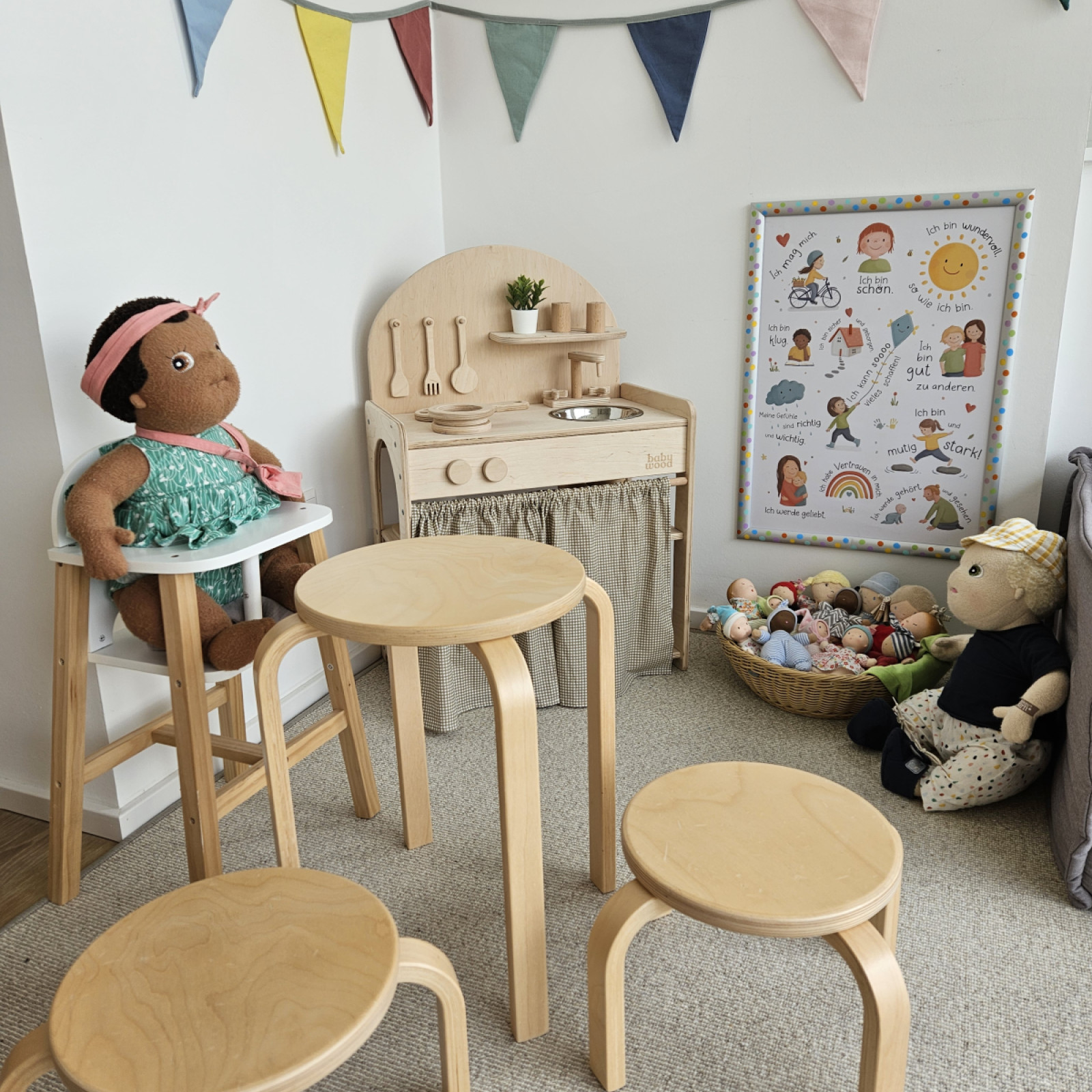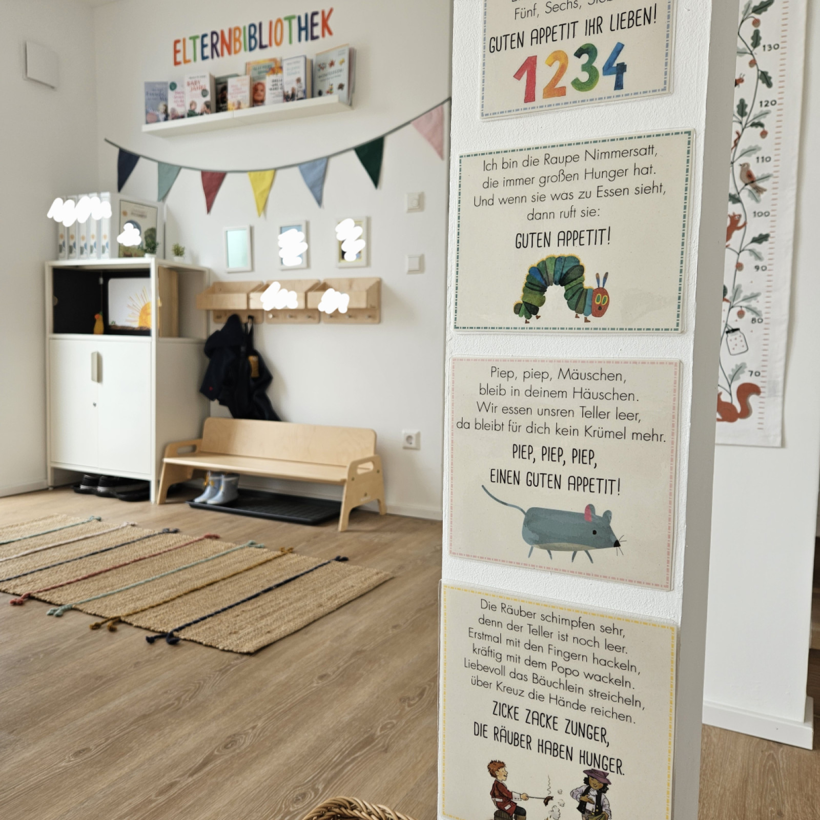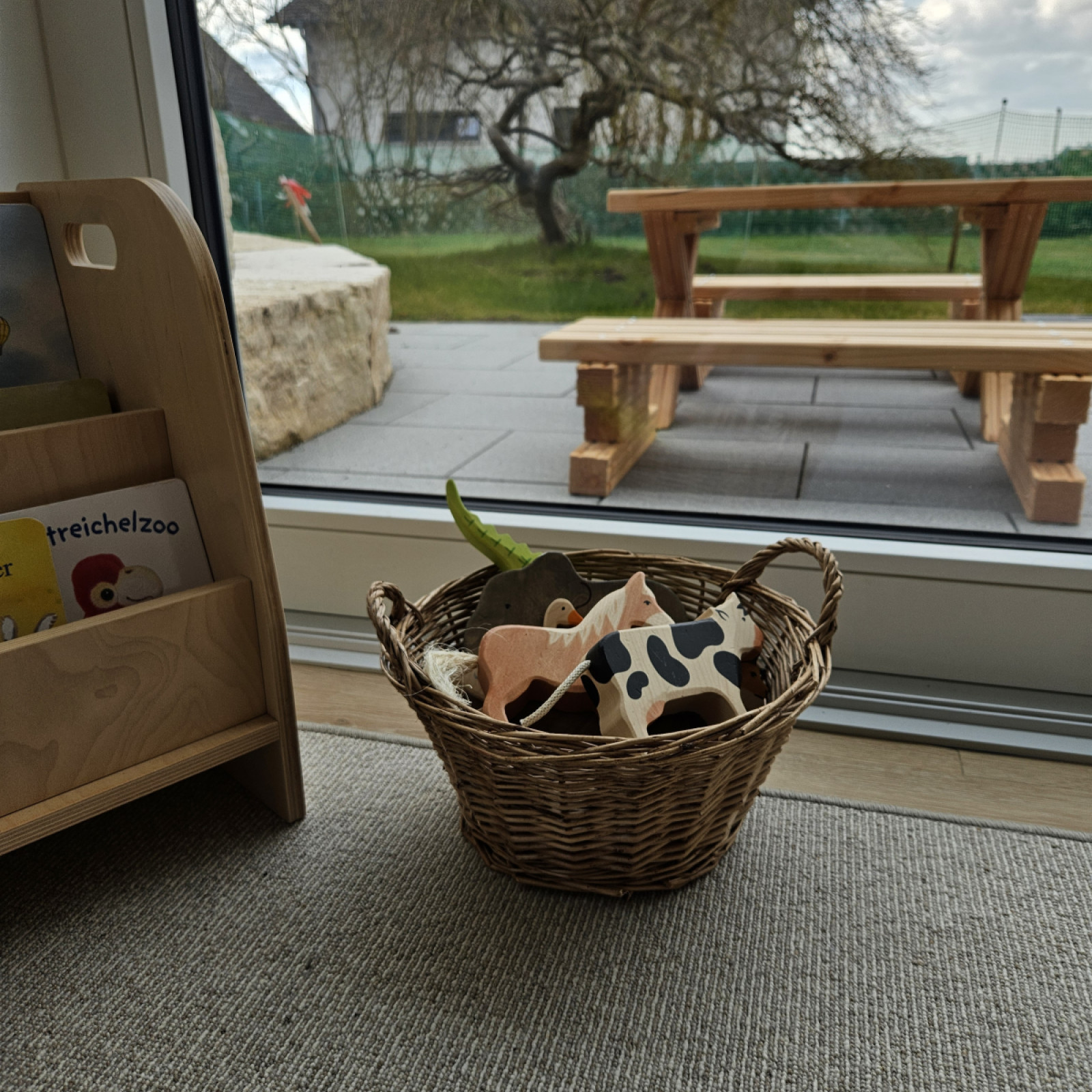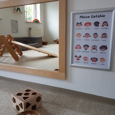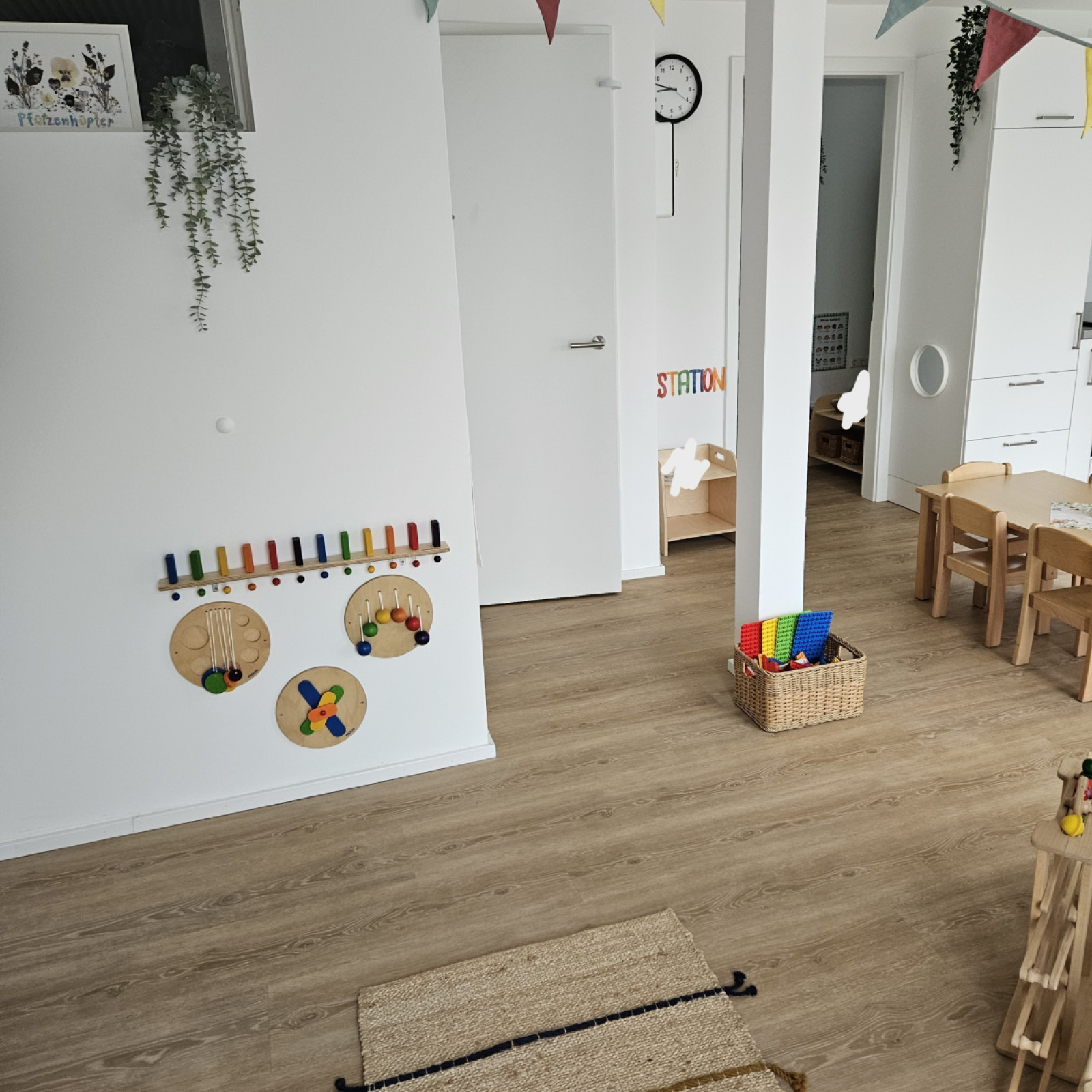 Für die kindgerechte Gestaltung der Räumlichkeiten habe ich mir sehr viel Zeit genommen. Dabei habe ich darauf geachtet, dass die Kinder im Alltag möglichst selbstständig sein können und nicht durch unnötige Barrieren eingeschränkt werden. Das angebotene Spielmaterial ist anregend präsentiert und soll dazu einladen selbst aktiv zu werden. Dies fördert die kindliche Neugier und die Selbstwirksamkeit. Ich tausche das Spielmaterial in regelmäßigen Abständen aus um es an die Bedürfnisse der Kinder anzupassen. So wirken die Räume auch nicht zu überladen. Das für die Kinder verfügbare Material ist bewusst nur auf Kinderhöhe platziert. Ein stets vorbereiteter Raum, der an die Entwicklungsschritte und Interessen der Kinder angepasst ist, ist daher sehr wichtig.