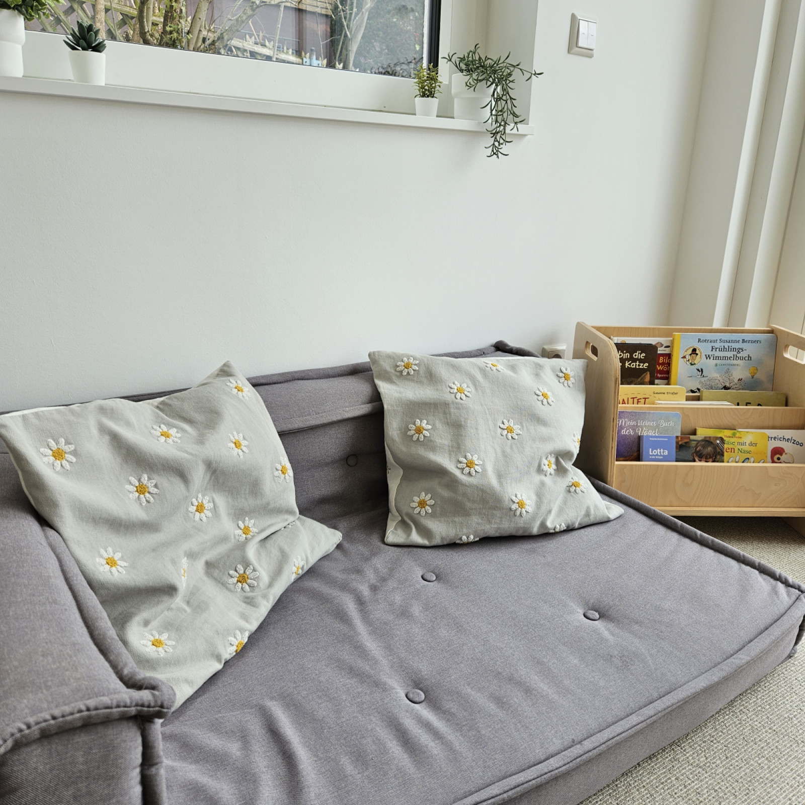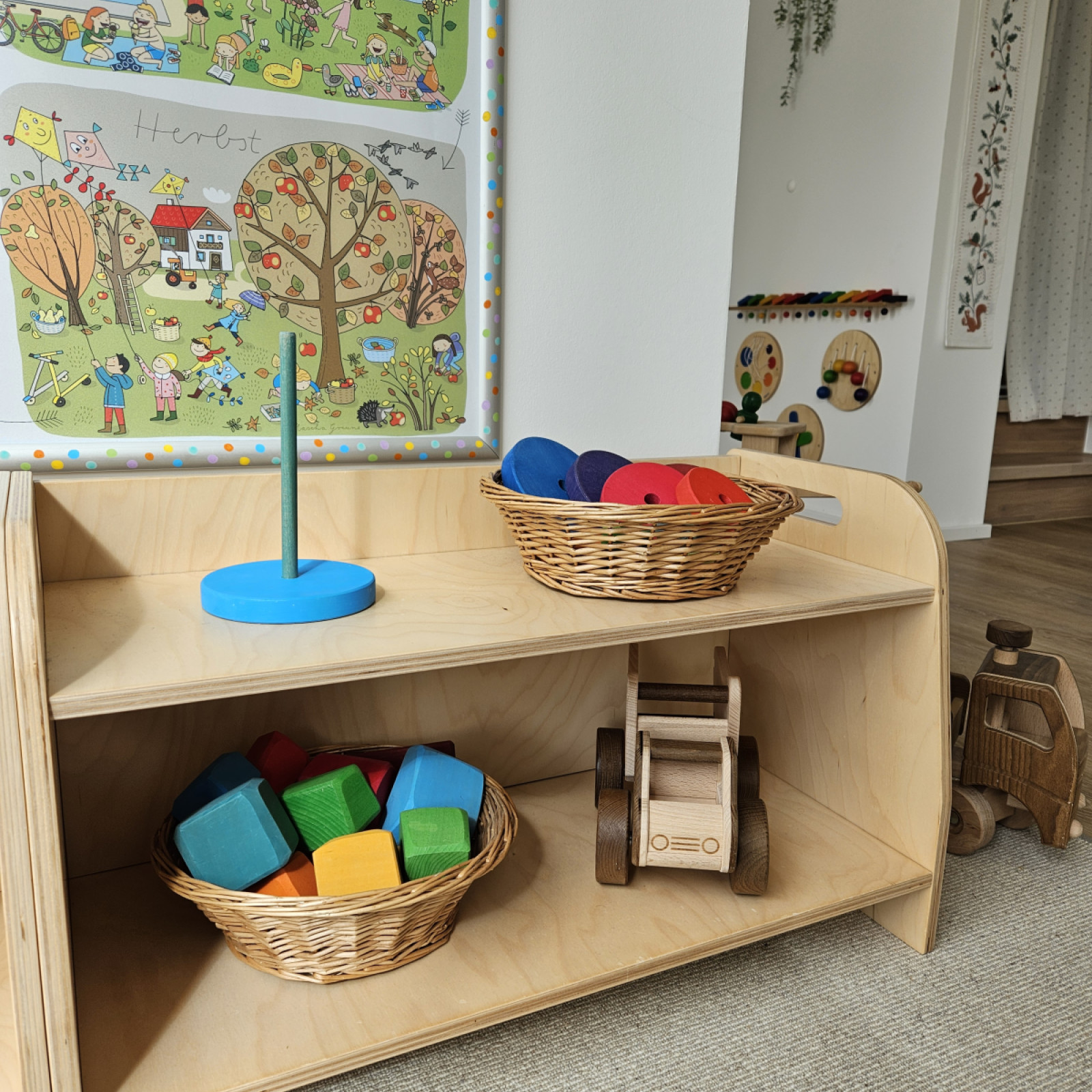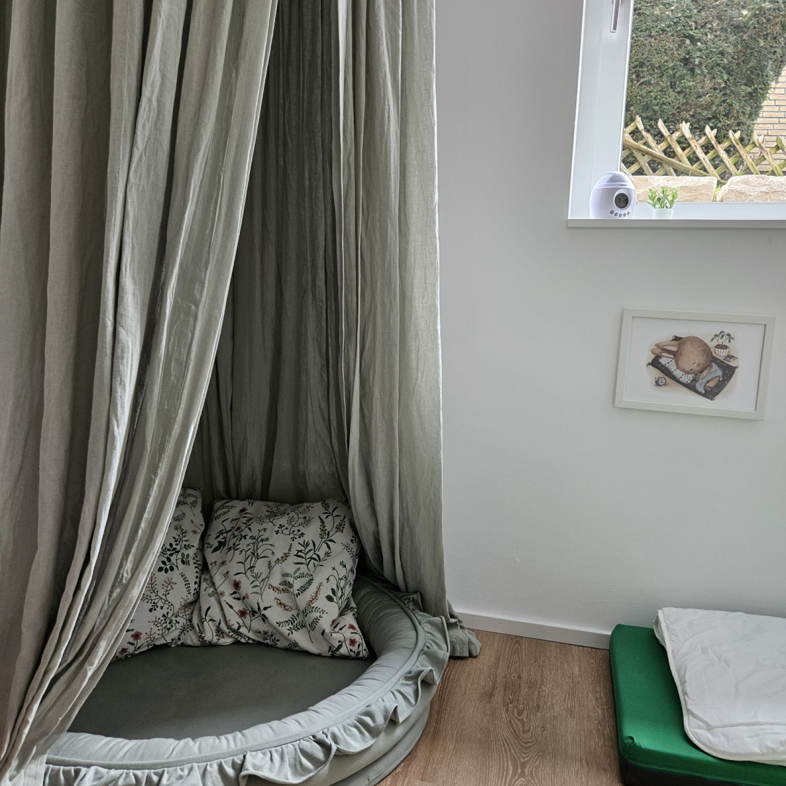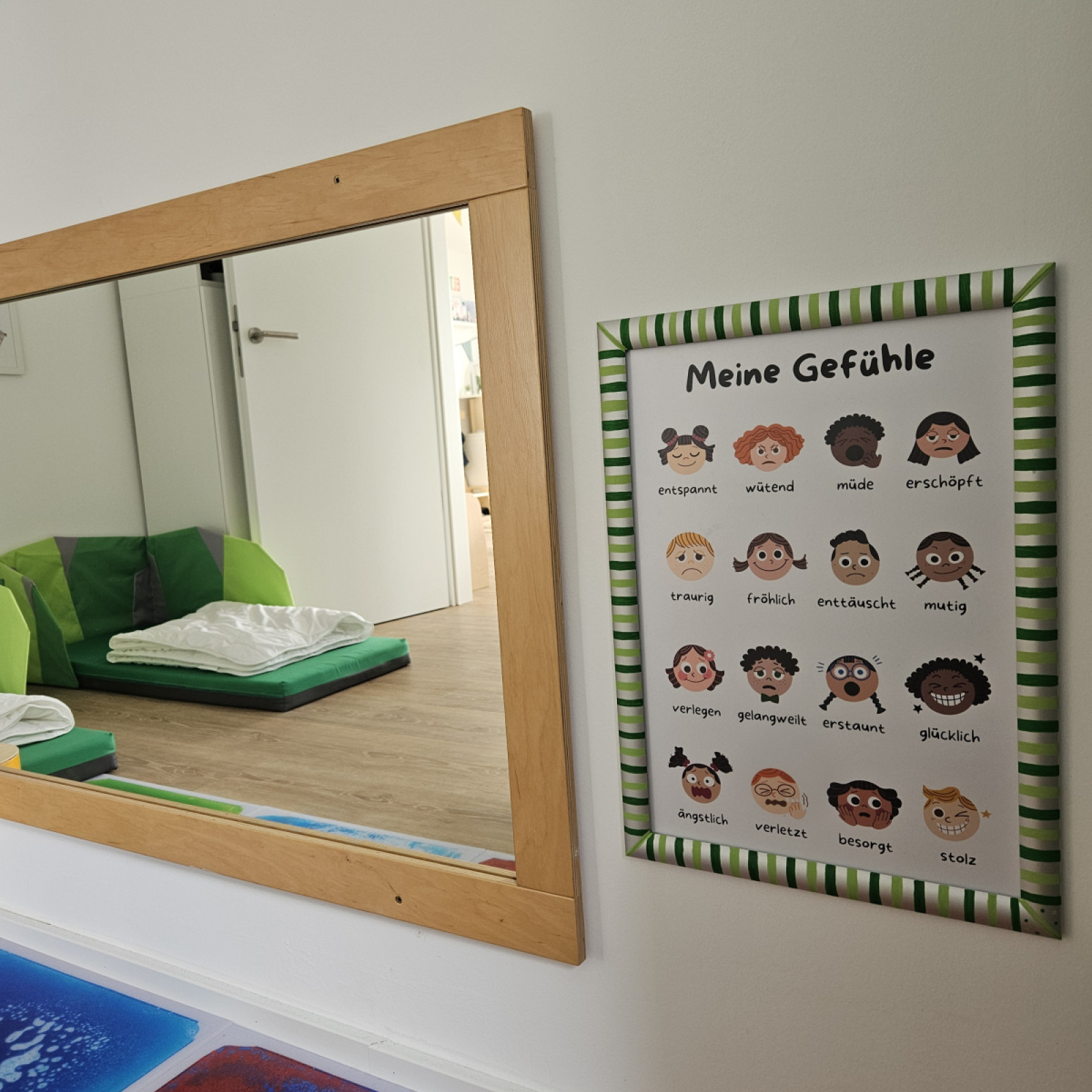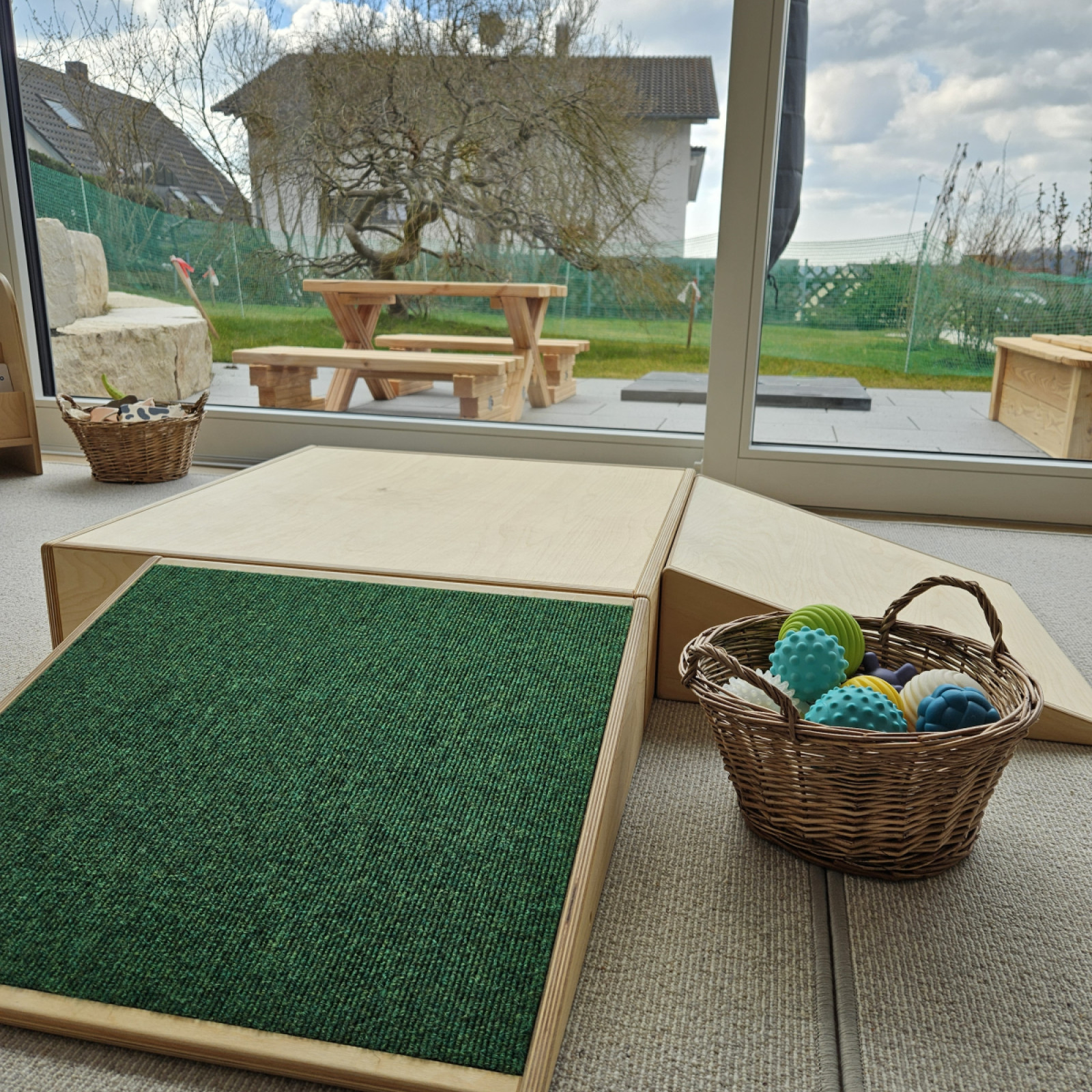 Für die kindgerechte Gestaltung der Räumlichkeiten habe ich mir sehr viel Zeit genommen. Dabei habe ich darauf geachtet, dass die Kinder im Alltag möglichst selbstständig sein können und nicht durch unnötige Barrieren eingeschränkt werden. Das angebotene Spielmaterial ist anregend präsentiert und soll dazu einladen selbst aktiv zu werden. Dies fördert die kindliche Neugier und die Selbstwirksamkeit. Ich tausche das Spielmaterial in regelmäßigen Abständen aus um es an die Bedürfnisse der Kinder anzupassen. So wirken die Räume auch nicht zu überladen. Das für die Kinder verfügbare Material ist bewusst nur auf Kinderhöhe platziert. Ein stets vorbereiteter Raum, der an die Entwicklungsschritte und Interessen der Kinder angepasst ist, ist daher sehr wichtig.